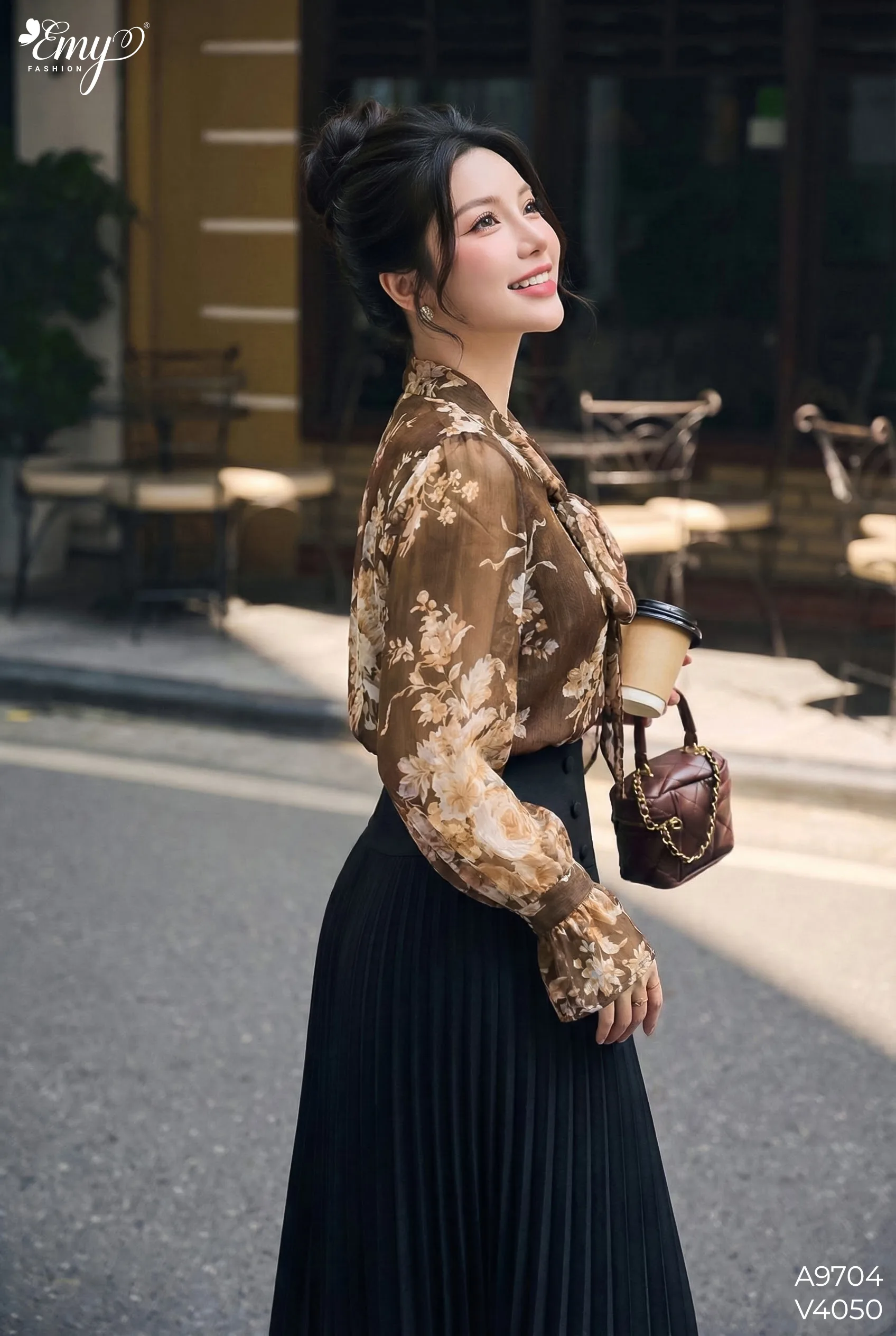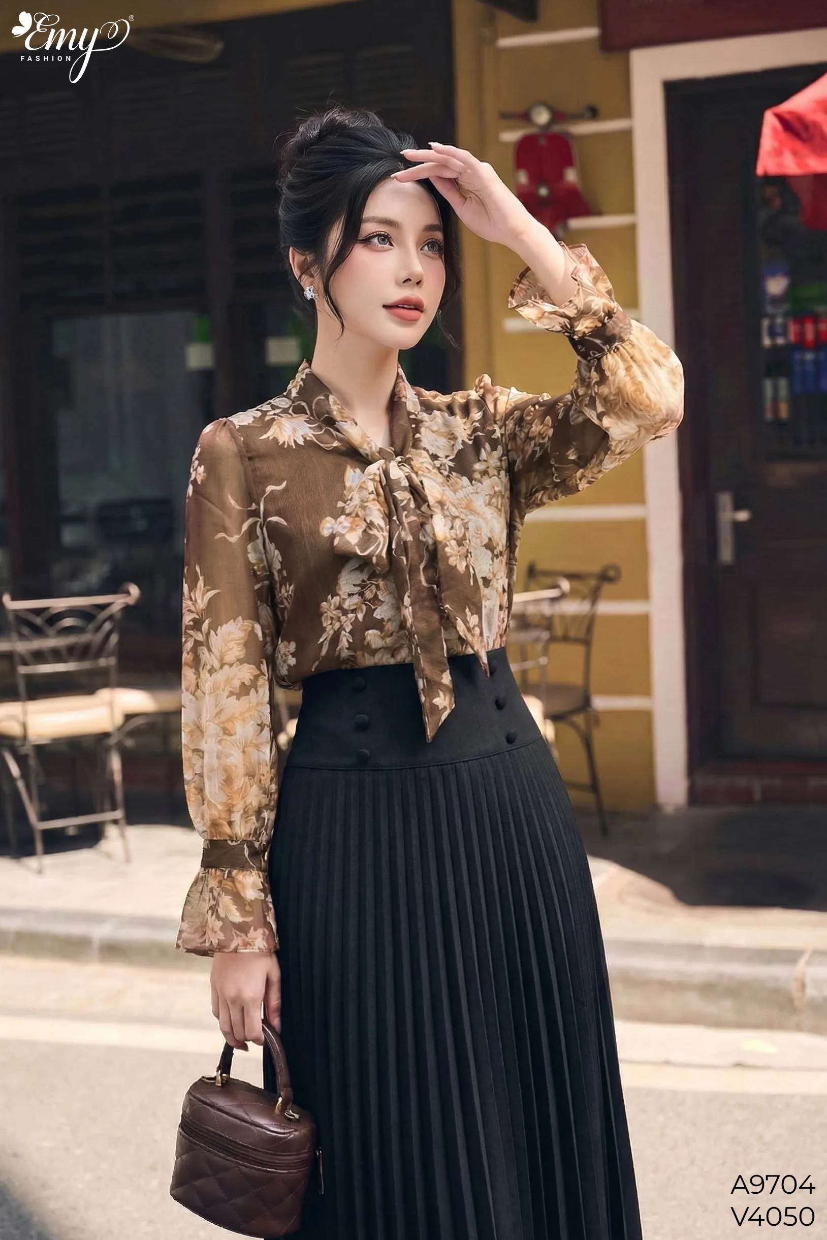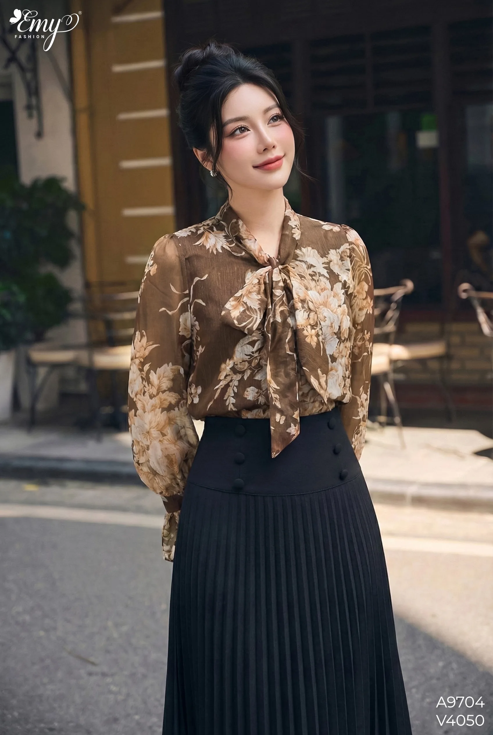A9704 Áo Voan Chiffon Nâu Thắt Nơ Cổ