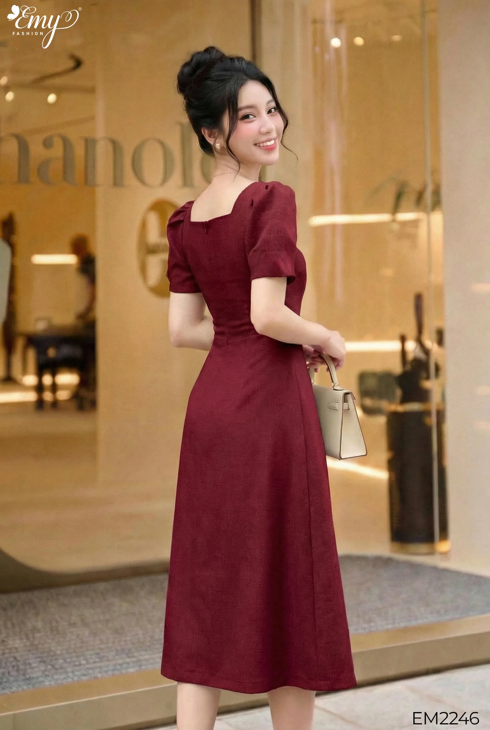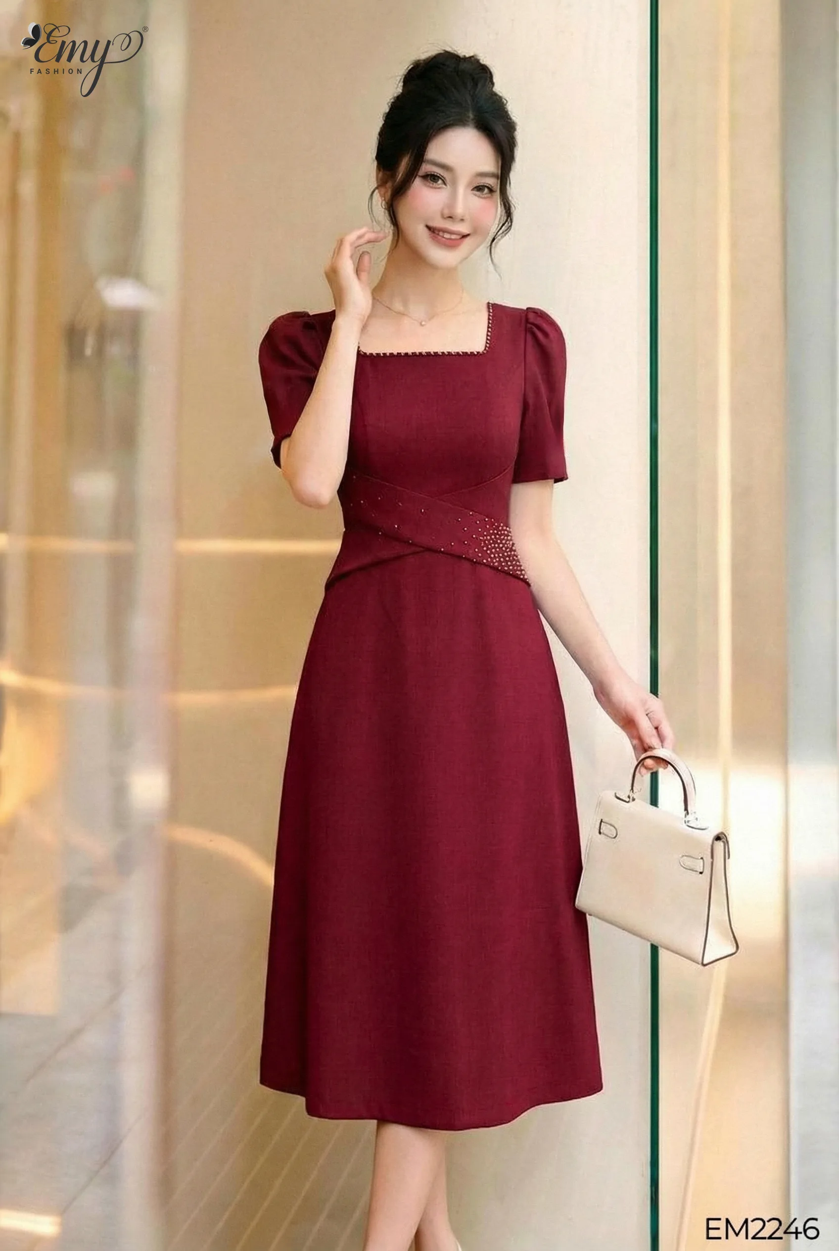 Chiếc EM2246 – Đầm Xoè Đỏ Cổ Vuông Chéo Eo này chính là kiểu thiết kế như vậy — đủ nổi bật để ghi dấu, đủ tinh tế để giữ lại sự thanh lịch.